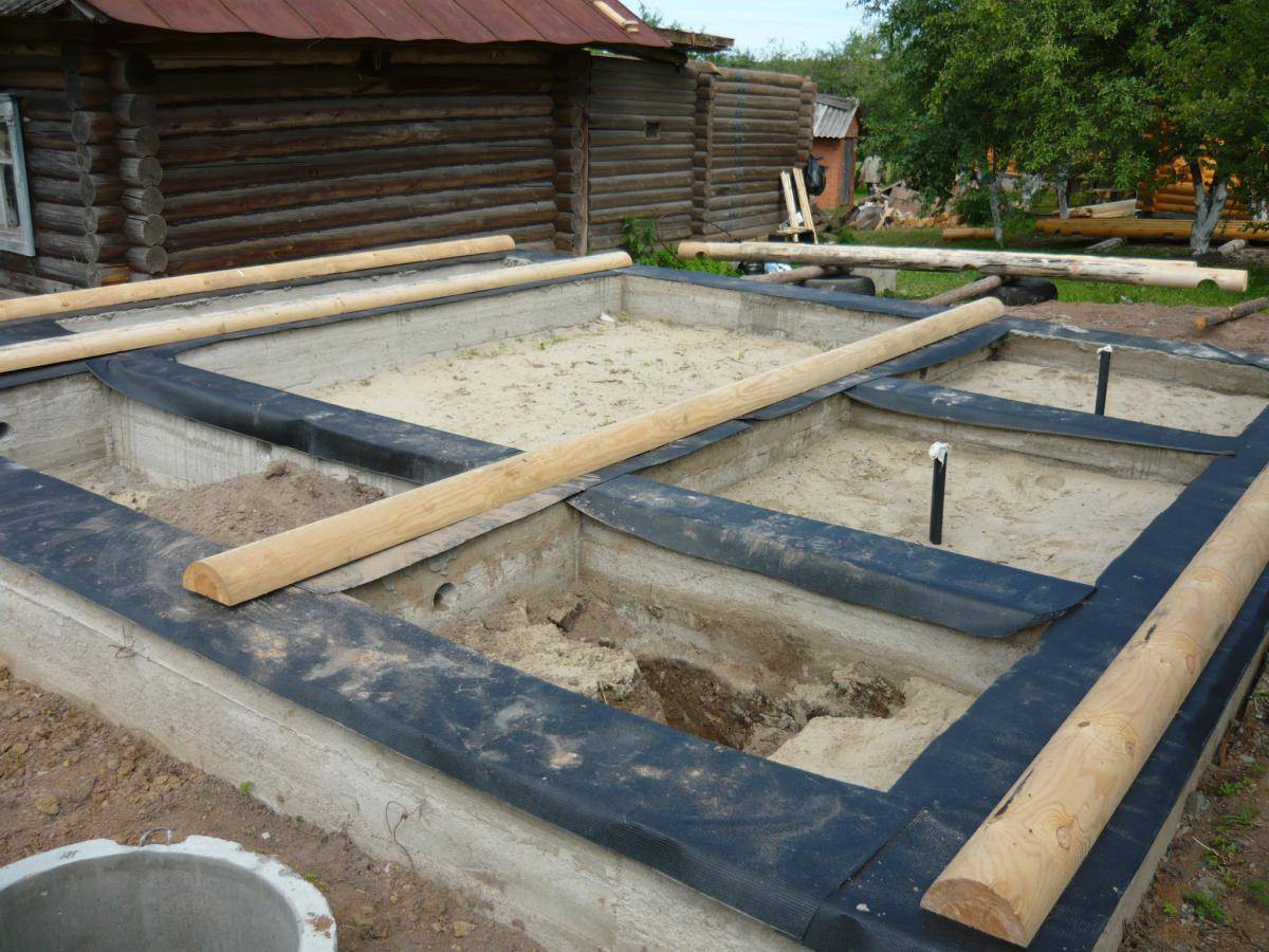 В вырытый котлован под фундамент сначала насыпается слой глины толщиной примерно 20-30 см. Вместо глины может использоваться и песчаная подушка того же размера. Песок или глина, в зависимости от того, что было взято для подушки, тщательно трамбуется. Поверх утрамбованной подушки делается бетонная стяжка толщиной 5 см.