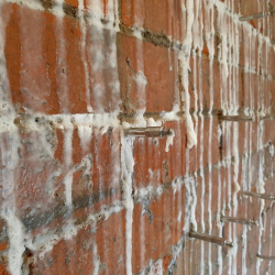 Этапы: осушение тепловыми пушками, удаление старых покрытий, зачистка швов на 50 мм, расшивка трещин, выравнивание стен. Мы предоставляем оборудование.