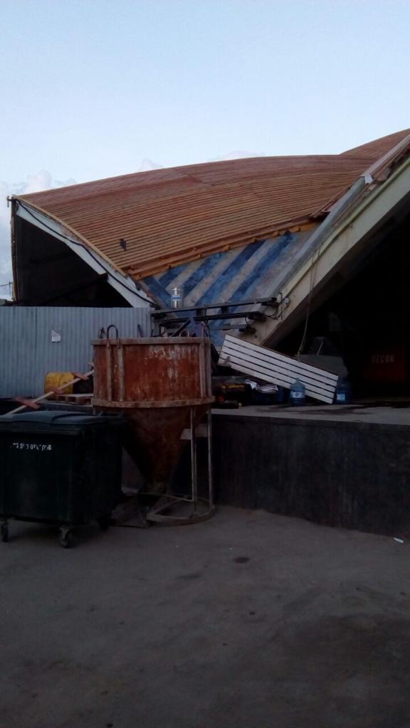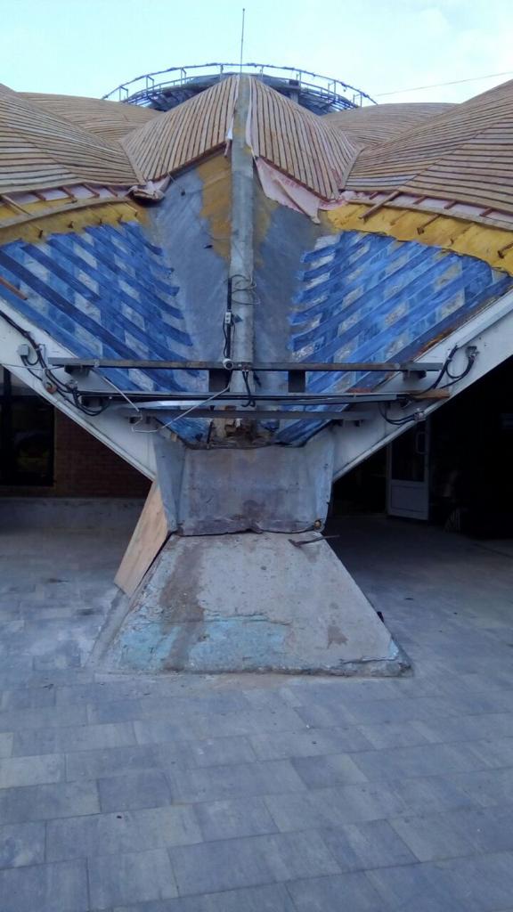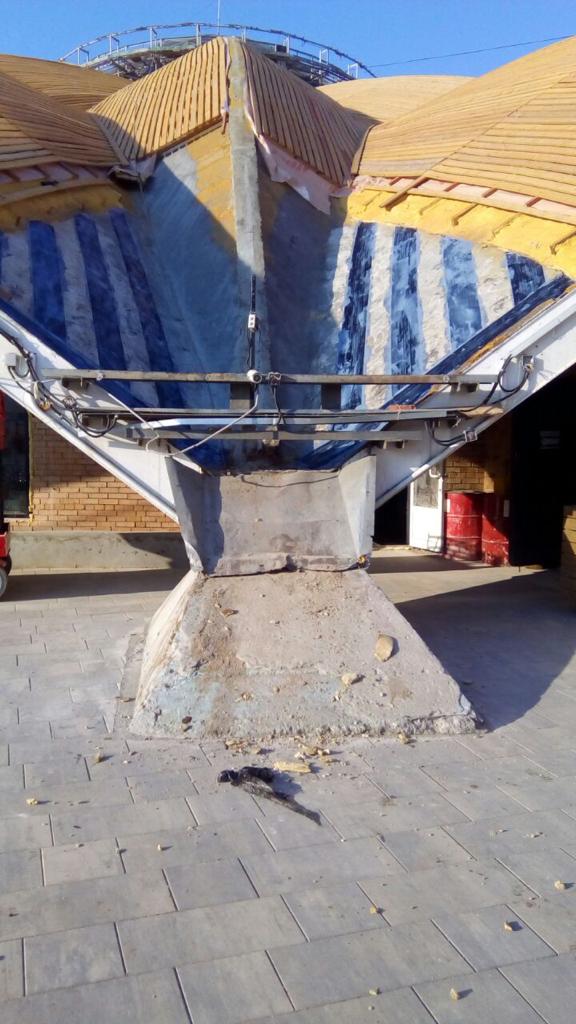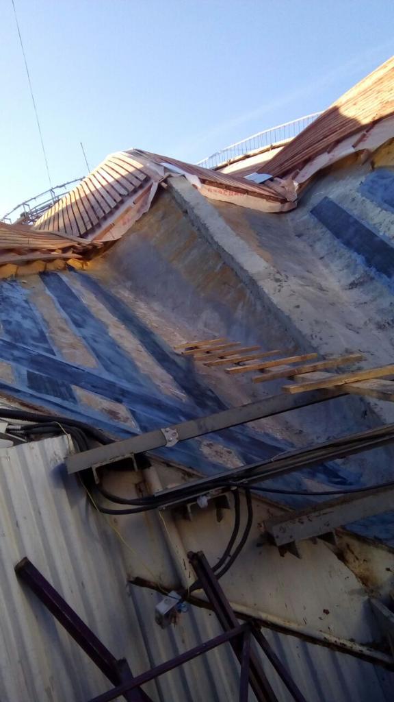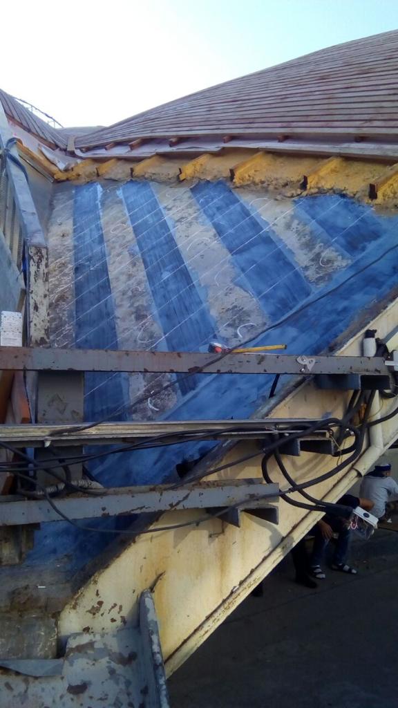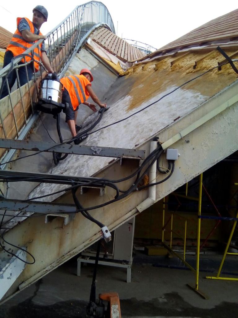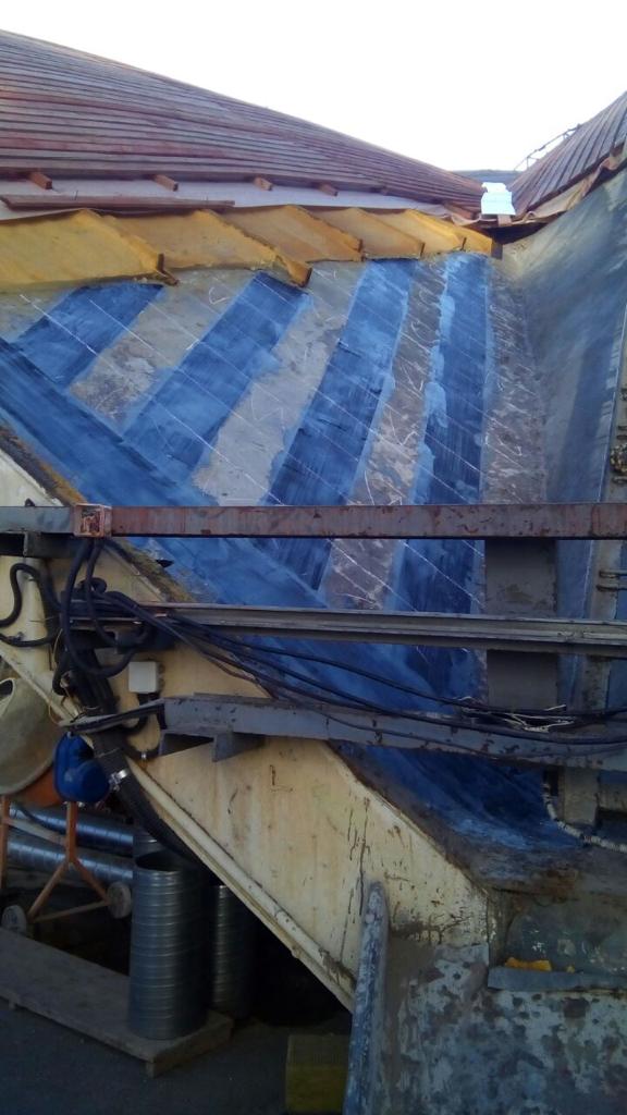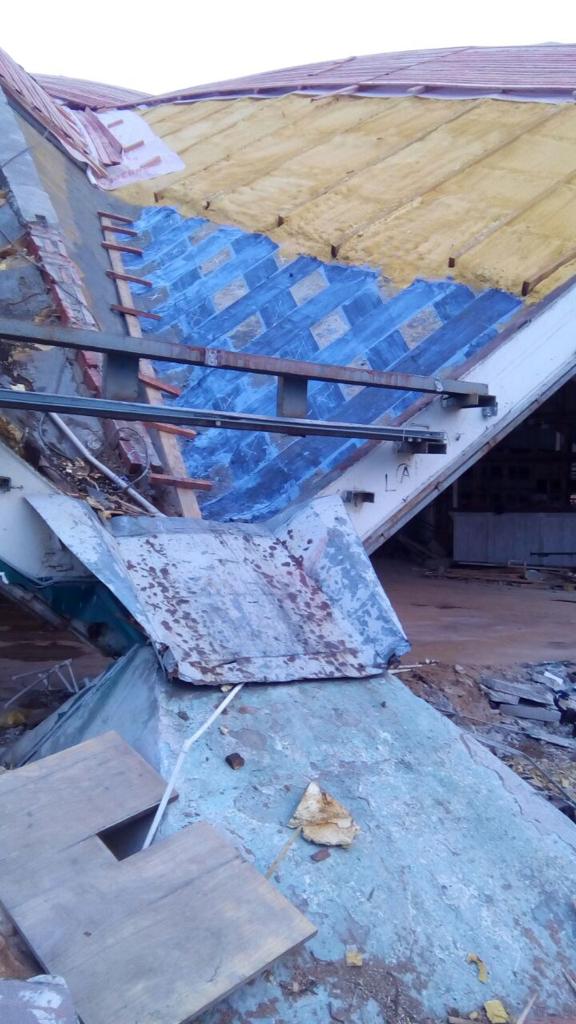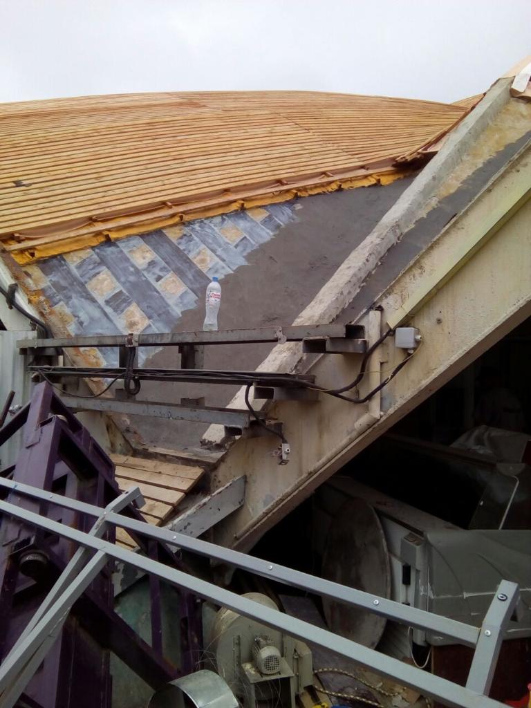 Решение: Усиление строительных конструкций, ребер жёсткости, бетонных элементов и кровли металлом и углеволокном. Площадь 600 м2
