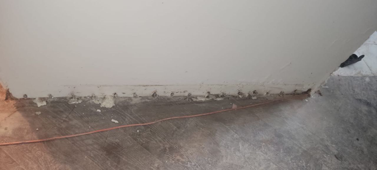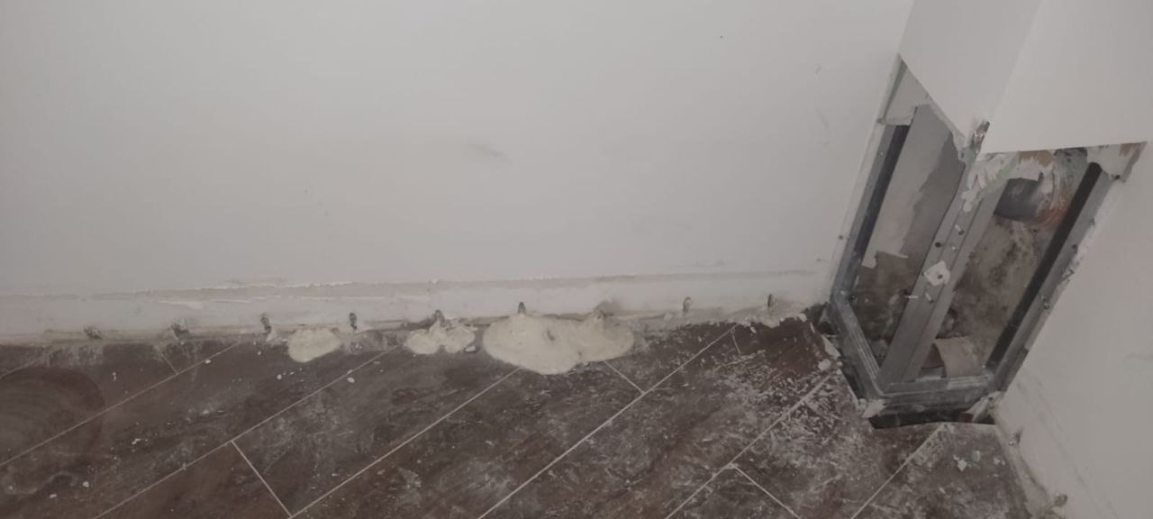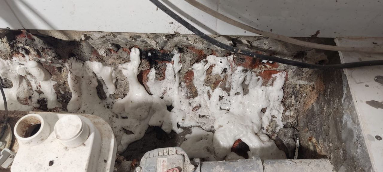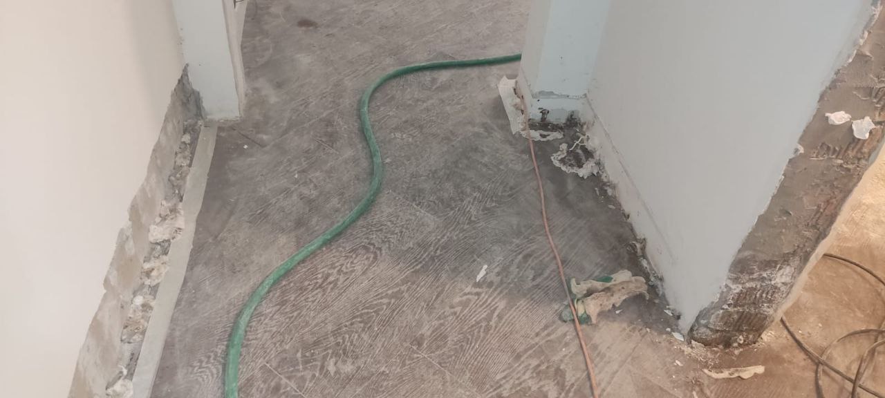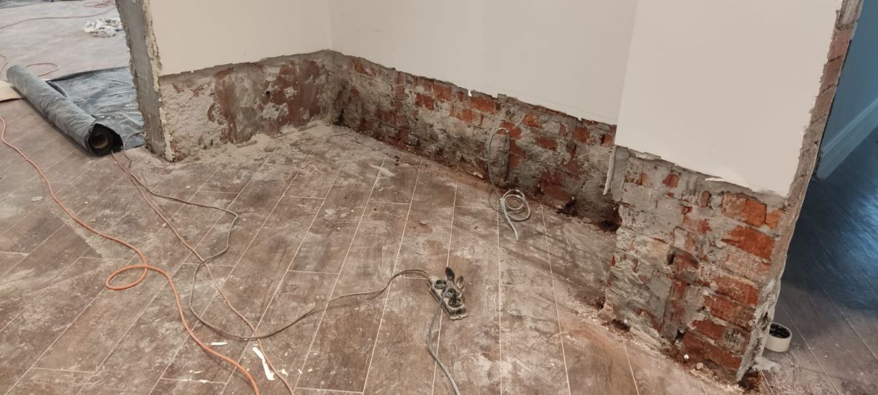 Выполненная работа: Разбор стенных и половых покрытий, удаление штукатурки и плитки, а также применение инъекций смолы и пены.