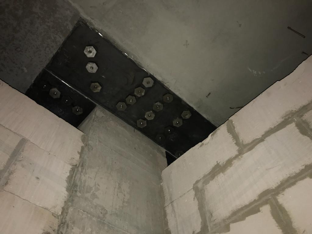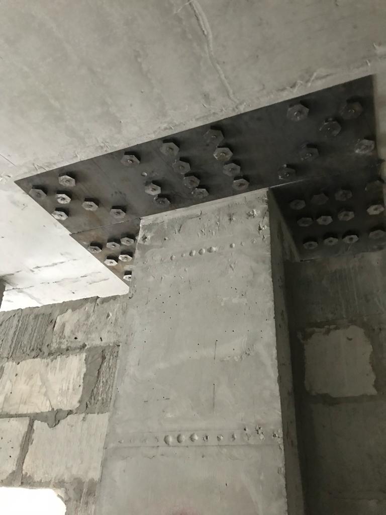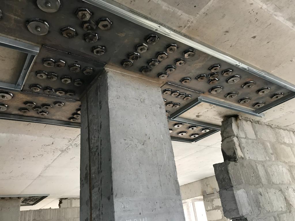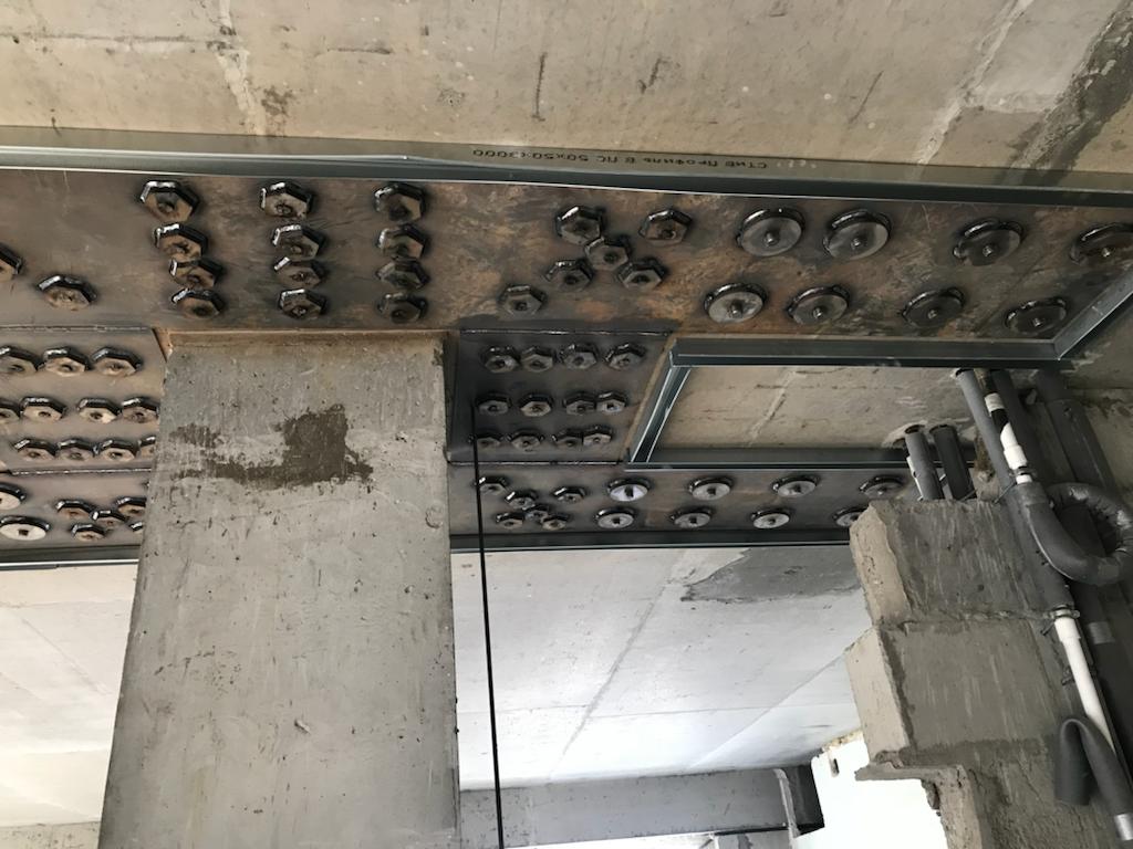 Решение: Обследование конструкций, разметка, точечное сверление алмазных станков. Монтаж шпилек, заливка клея, после установка металлических листов, и затяжкой под момент 600 Нм. После сварка всех соединений сваркой полу автомат, проволокой 1, 2 мм. В завершении усиление жб конструкций и плит торкеретированием бетона. Площадь более 50 000 м2