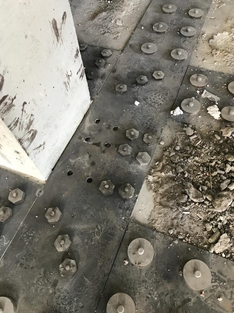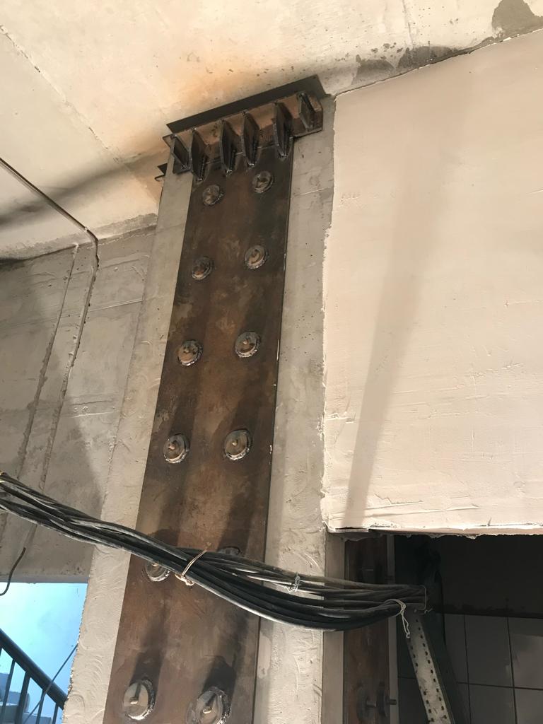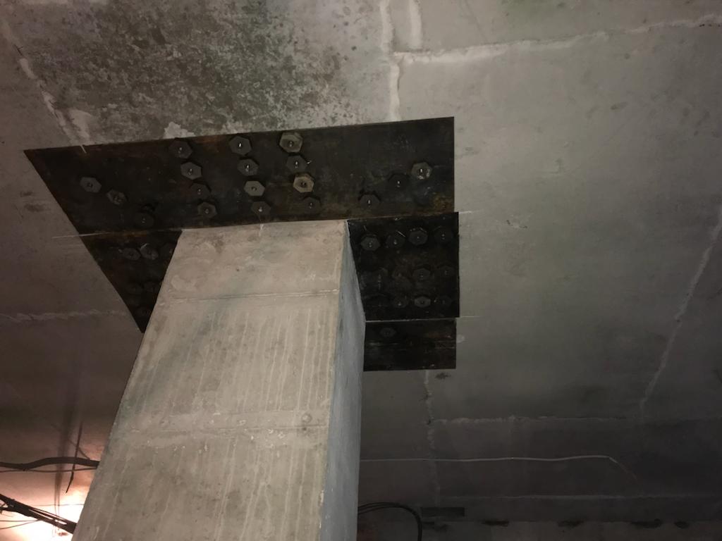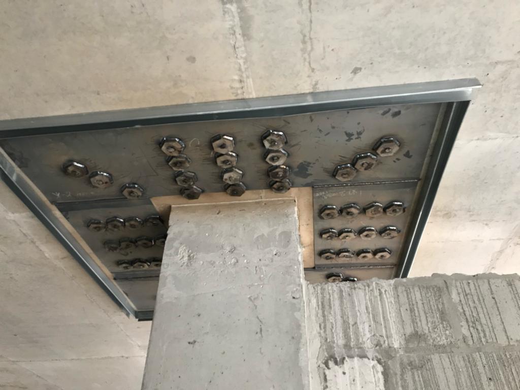 Решение: Обследование конструкций, разметка, точечное сверление алмазных станков. Монтаж шпилек, заливка клея, после установка металлических листов, и затяжкой под момент 600 Нм. После сварка всех соединений сваркой полу автомат, проволокой 1, 2 мм. В завершении усиление жб конструкций и плит торкеретированием бетона. Площадь более 50 000 м2