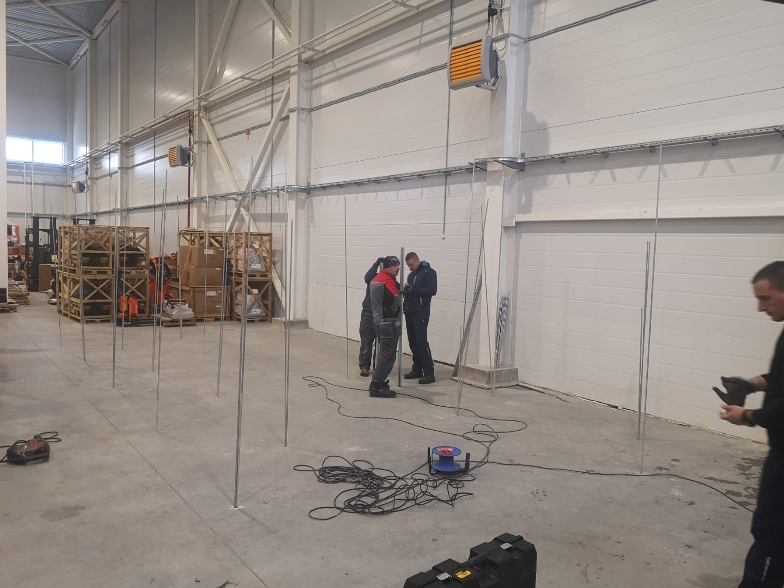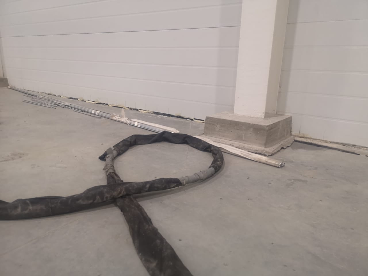 Выполненная работа: Стабилизация основания плиты пола склада, заполнение пустот в подплитном пространстве и подъем плиты пола склада до необходимых отметок.