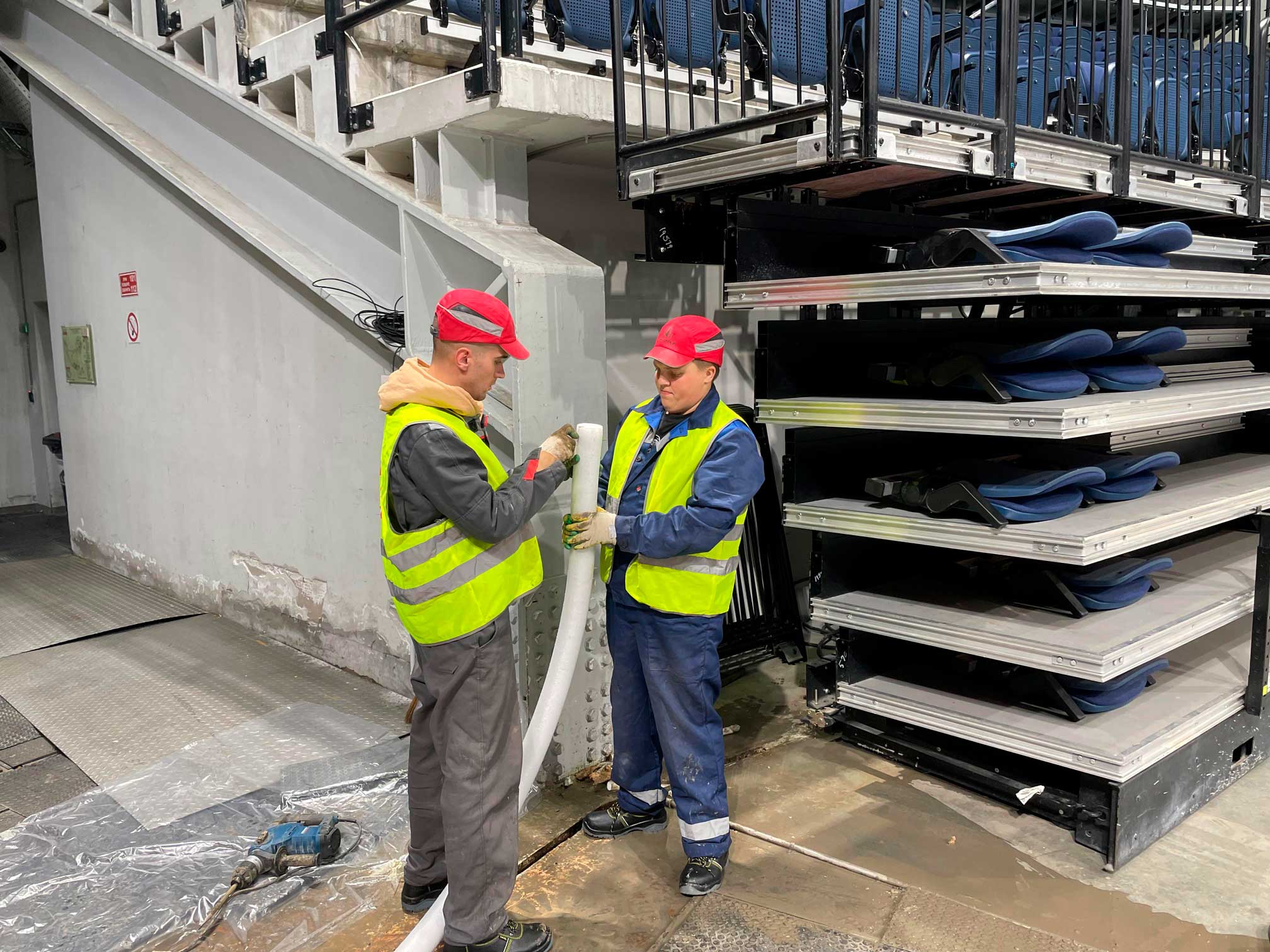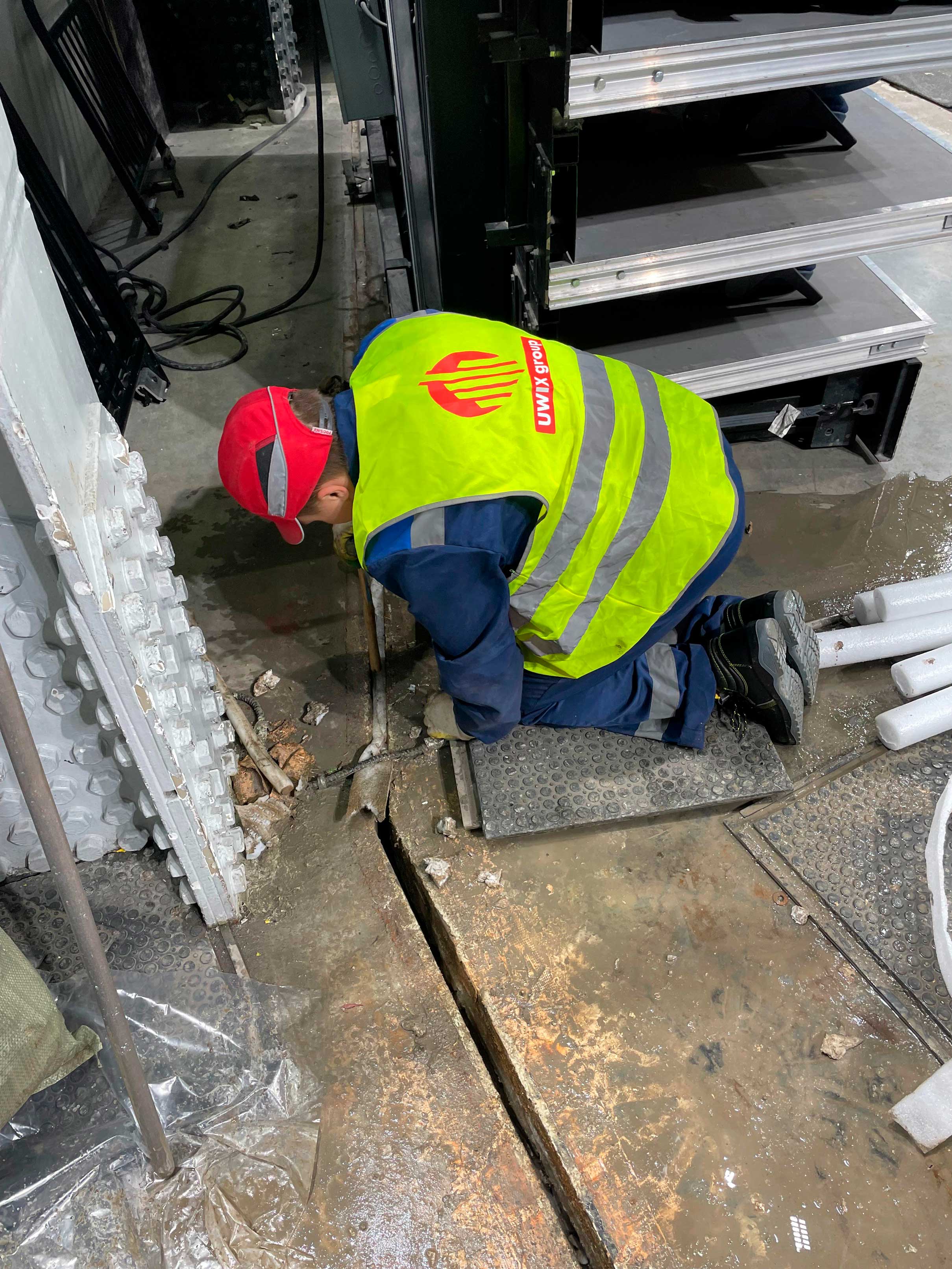 Выполненная работа: Устранение протечки деформационного шва в зоне выезда снегоуборочной машины. Вскрытие и расчистка шва, подготовка к заполнению шва акрилатным составом.